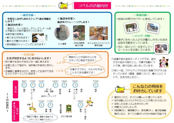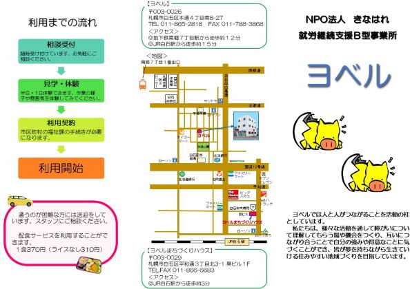 <ヨベル> 月~金 9:00~17:00(土・日・祝休) 10:00~15:00 ※地域のイベントに参加する場合は、土・日に通所となる場合もございます。詳しくはスタッフまでお問い合わせ下さい。 北海道札幌市白石区本通4丁目南8-27 地下鉄東西線「南郷7丁目駅」徒歩12分 JR白石駅徒歩15分